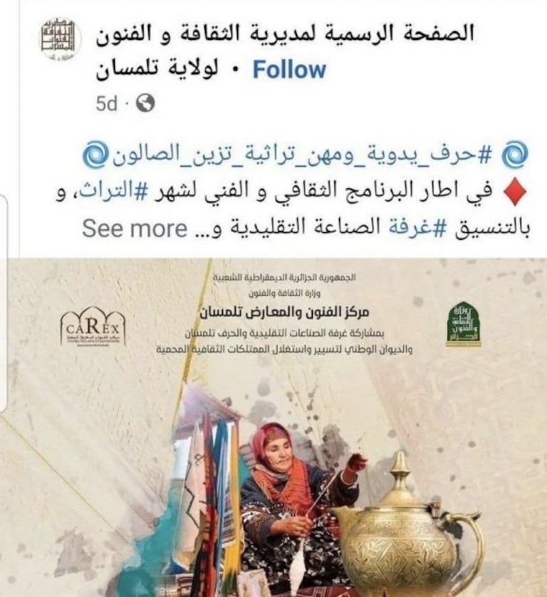 والمفارقة أننا نشهد مثل هذا السطو أيضا في تلمسان، وهي أكثر المدن الجزائرية التي تحمل الطابع المغربي ولكن يتم رفض هذه الحقيقة. وهكذا، للترويج لمعرض الصناعة التقليدية في مدينة تلمسان الذي يقام في الفترة من 15 إلى 18 ماي، قامت إدارة الثقافة والفنون في تلمسان بسرقة صورة سيدة مغربية عجوز تغزل الصوف لتجعل منه الشخصية المركزية في ملصقها الدعائي للمعرض.