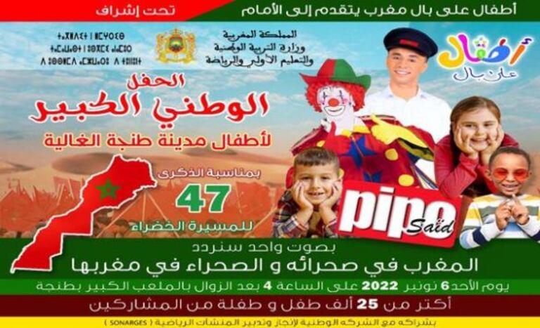 © Copyright : DR وتابع سعيد بيبو : "الملعب الكبير بمدينة طنجة يحتضن هذا الحدث الفني الوطني، على الساعة الرابعة زوالا، حيث ينتظر أن يحج إليه أزيد من 35 ألف طفل، سيصدحون بصوت واحد ووحيد "المغرب في صحرائه والصحراء في مغربها"، وهو عنوان موضوع هذا الحفل الوطني المميز، المنتظر أن تتابعه وسائل إعلام وطنية ودولية".