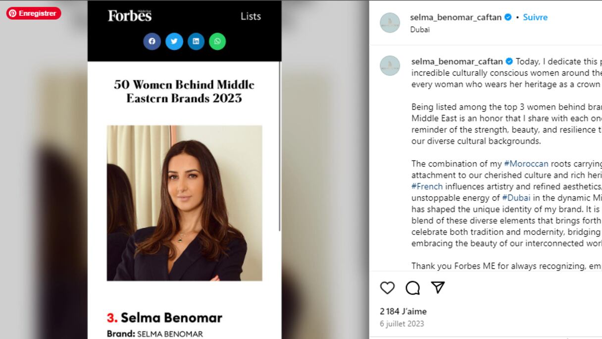 وأردفت: «مزيج جذوري المغربية التي تحمل ارتباطا عميقا بثقافتنا العزيزة وتراثنا الغني، والفن والجمال الرفيع الذي أستلهمه من تأثيراتي الفرنسية، والطاقة التي لا تقاوم لدبي في منطقة الشرق الأوسط الديناميكية، قد شكلت هوية فريدة لعلامتي التجارية. إنه المزيج المتناغم لهذه العناصر المتنوعة الذي يجلب إبداعات تحتفل بكل من التقاليد والحداثة، وتجسر بين الثقافات وتحتضن جمال عالمنا المترابط. شكرا فوربس الشرق الأوسط على الاعتراف الدائم بجهود النساء في مجال الأعمال وتمكينهن ودعمهن».