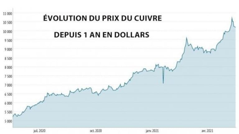 لم يكن النحاس باهظ الثمن في التاريخ مثلما هو عليه الحال اليوم. فمنذ 7 ماي 2021، فإن طنا واحدا من النحاس تم تداوله في بورصة لندن للمعادن بأكثر من 10000 دولار (10300 دولار على وجه الدقة)، محطما بذلك الرقم القياسي السابق الذي يعود تاريخه إلى فبراير 2011.