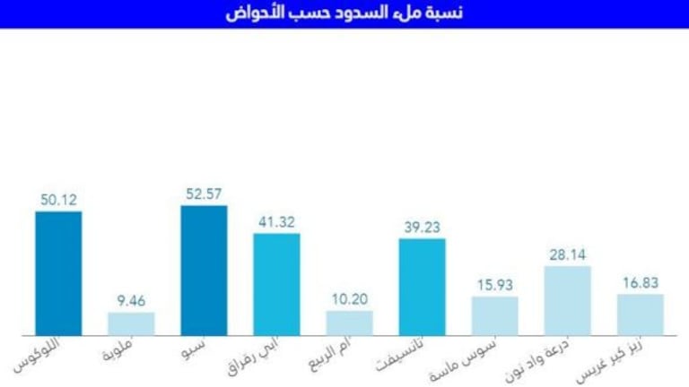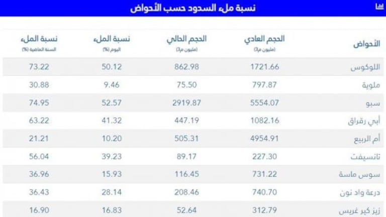 وبلغة الأرقام، فإن نسبة ملء سد اللوكوس وصلت لـ%50.12، فيما بلغت حقينة سد ملوية إلى نسبة %9.46، أما نسبة ملء سد سبو فتصل إلى %52.57، في حين تقدر نسبة ملء سد أبي رقراق بـ%41.32، أما سد أم الربيع فوصلت نسبة الملء به إلى %10.20، وسد تانسيفت إلى %39.23، وسد سوس ماسة %15.93، فيما بلغت نسبة ملء سد درعة وادنون إلى %28.14، وأخيرا سد زيز كير غريس بنسبة ملء لا تتجاوز 16.83 في المائة.
