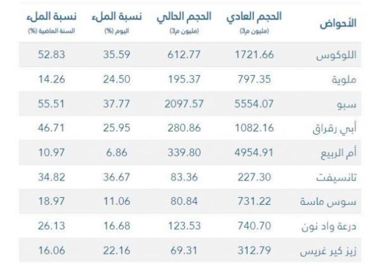 بلغة الأرقام، وحسب المعطيات المحينة التي توفرها وزارة التجهيز والماء، فإن نسبة ملء حوض اللوكوس وصلت لـ%35.59، فيما بلغت حقينة حوض ملوية إلى نسبة %24.50، أما نسبة ملء حوض سبو فتصل إلى %37.77، في حين تقدر نسبة ملء حوض أبي رقراق بـ%25.95، أما حوض أم الربيع فوصلت نسبة الملء به إلى %6.86، وحوض تانسيفت إلى %36.67، وحوض سوس ماسة %11.06، فيما بلغت نسبة ملء حوض درعة وادنون إلى %16.68، وأخيرا حوض زيز كير غريس بنسبة ملء لا تتجاوز 22.16 في المائة.