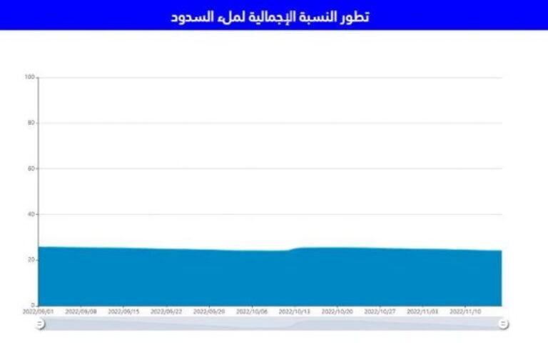 ويبلغ الحجم الإجمالي لحقينة السدود المائية المغربية، بتاريخ 16 نونبر 2022، حوالي 3883.41 مليون متر مكعب وهو ما يمثل 24.09 في المائة، مسجلا بذلك تراجعا كبيرا مقارنة مع نفس الفترة من السنة الماضية، إذ بلغ آنذاك حجم ملء السدود 5617.09 مليون متر مكعب، وبنسبة تجاوزت %34 آنذاك.