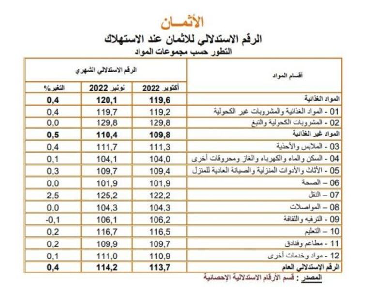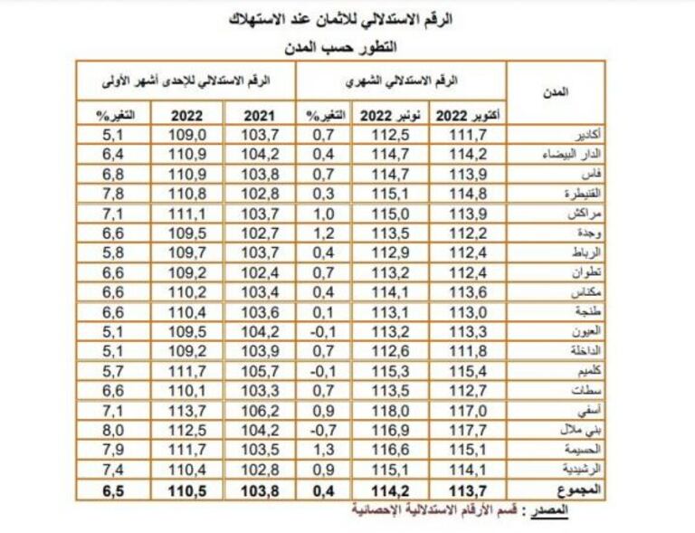 وحسب ما جاء في مذكرة إخبـارية للمندوبية السامية للتخطيط تحت عنوان "الرقم الاستدلالي للأثمان عند الاستهلاك لشهر نونبر 2022، فإن الرقم الاستدلالي للأثمان عند الاستهلاك، خلال شهر نونبر 2022، سجل ارتفاعا ب %0.4 بالمقارنة مع الشهر السابق. وقد نتج هذا الارتفاع عن تزايد الرقم الاستدلالي للمواد الغذائية ب %0.4 والرقم الاستدلالي للمواد غير الغذائية ب %0.5.
