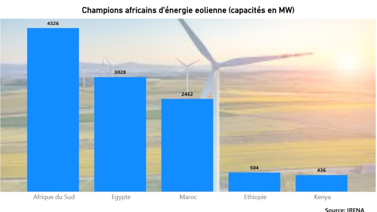 ومع ذلك، تمتلك جنوب إفريقيا، بقدرة 4326 ميغاواط، أكبر قدرة إجمالية مركبة لطاقة الرياح في إفريقيا، ما يمثل حوالي 38% من إجمالي القدرة المركبة. تليها مصر (3028 ميغاواط)، ثم المغرب (2452 ميغاواط)، ثم إثيوبيا (504 ميغاواط)، وأخيرا كينيا (436 ميغاواط).