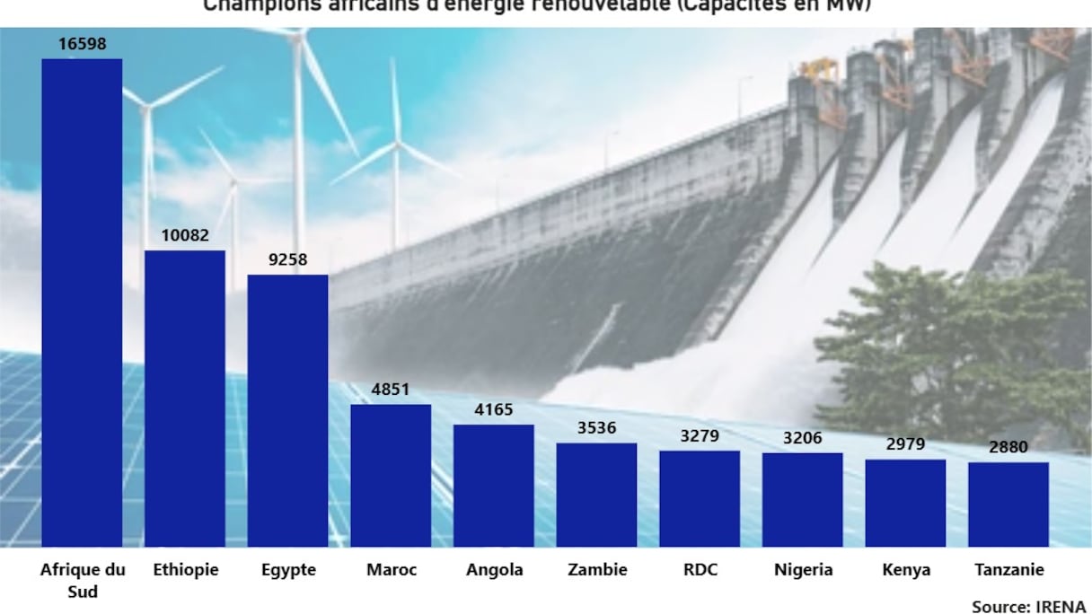 وتلي إثيوبيا في هذا الصدد كل من مصر (9250 ميغاواط)، والمغرب، أحد رواد الطاقات المتجددة في أفريقيا (4851 ميغاواط)، وأنغولا (4165 ميغاواط)، وزامبيا (3536 ميغاواط)، وجمهورية الكونغو الديمقراطية (3279 ميغاواط)، ونيجيريا (3206 ميغاواط)، وكينيا (2979 ميغاواط)، وتنزانيا (2880 ميغاواط). وتبلغ القدرة الإنتاجية الإجمالية لهذه الدول 60826 ميغاواط، ما يمثل 73.84% من إجمالي القدرة المركبة للطاقات المتجددة في القارة.