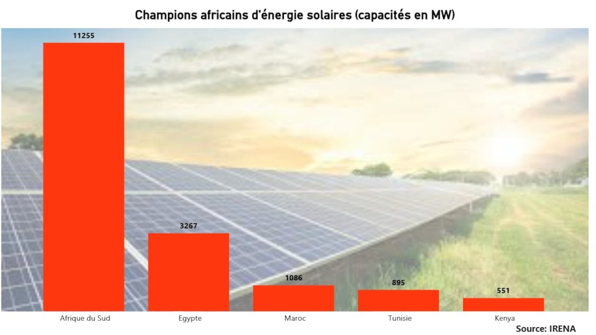 وتليها المغرب، إحدى الدول الرائدة في مجال الطاقة الشمسية في إفريقيا، بقدرة مركبة تبلغ 1086 ميغاواط. وتكمل تونس وكينيا، بقدرات مركبة تبلغ 895 ميغاواط و551 ميغاواط على التوالي، قائمة الدول الخمس الرائدة في مجال الطاقة الشمسية في أفريقيا.