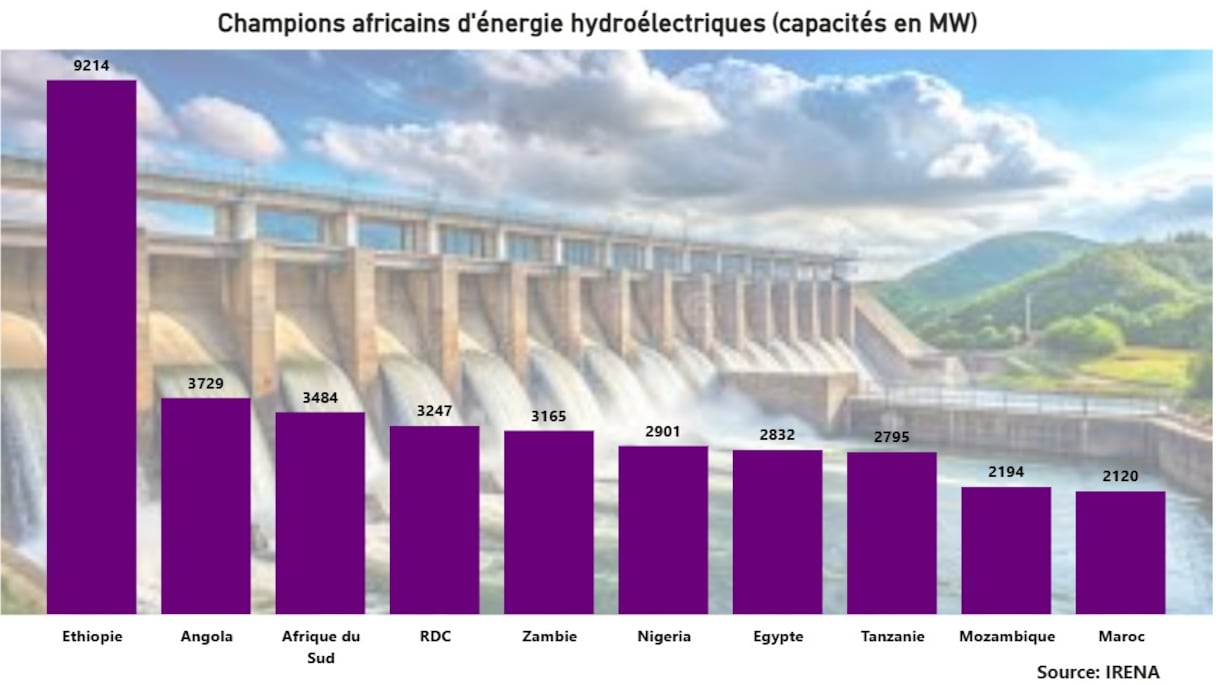 وتتصدر إثيوبيا قائمة الدول الإفريقية في مجال الطاقة الكهرومائية، بقدرة مركبة تبلغ 9214 ميغاواط، أي ما يقارب 19% من إجمالي القدرة المركبة في القارة.