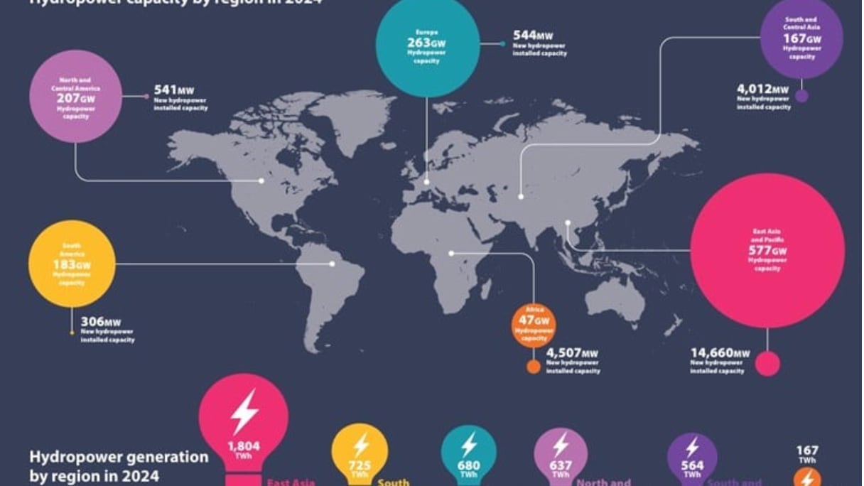 وبينما لا تزال العديد من السدود الكهرومائية الكبيرة قيد الإنشاء في أنحاء القارة، بلغت القدرة الكهرومائية المركبة 48.914 ميغاواط بنهاية عام 2025، مقارنة بـ1.46 مليون ميغاوط على مستوى العالم. ولهذا، لا تمثل إفريقيا سوى 3.36% من إجمالي القدرة المركبة لتوليد الطاقة الكهرومائية في العالم، على الرغم من إمكاناتها الهائلة.