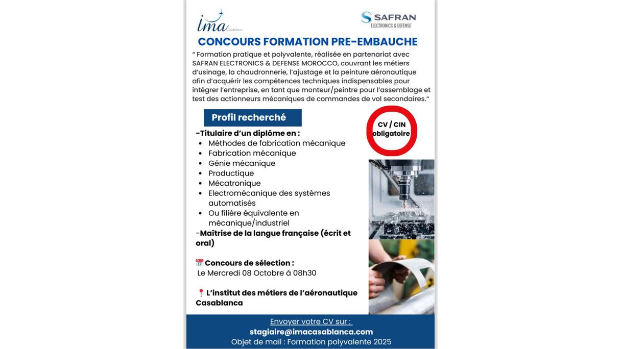 وأضاف: «المغرب بلد زاخر بالمواهب، يزدهر بقيادة الملك. يتمتع بديناميكية صناعية حقيقية وبنية تحتية متطورة». تعكس هذه الشهادة رسالة معهد مهن الطيران الأساسية: مواكبة هذا التطور في المهارات الوطنية، ومواصلة دعم منظومة صناعية مزدهرة.