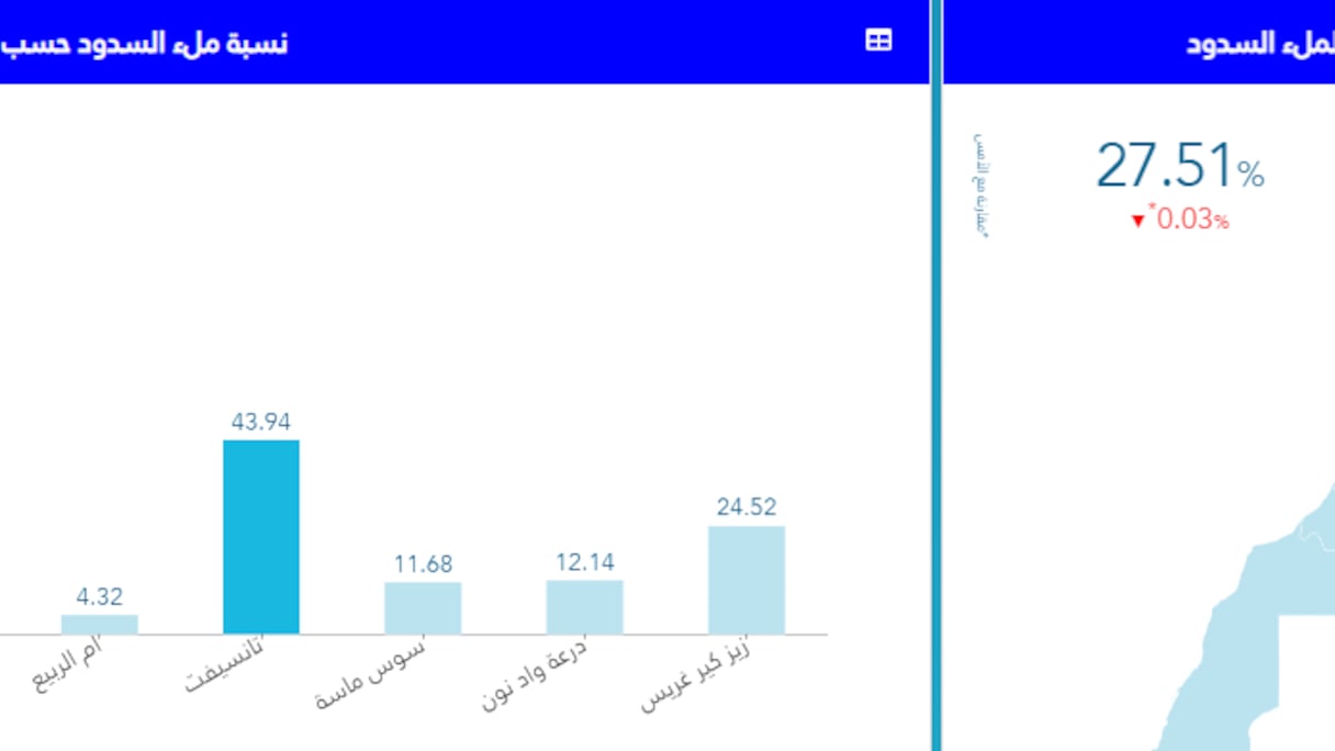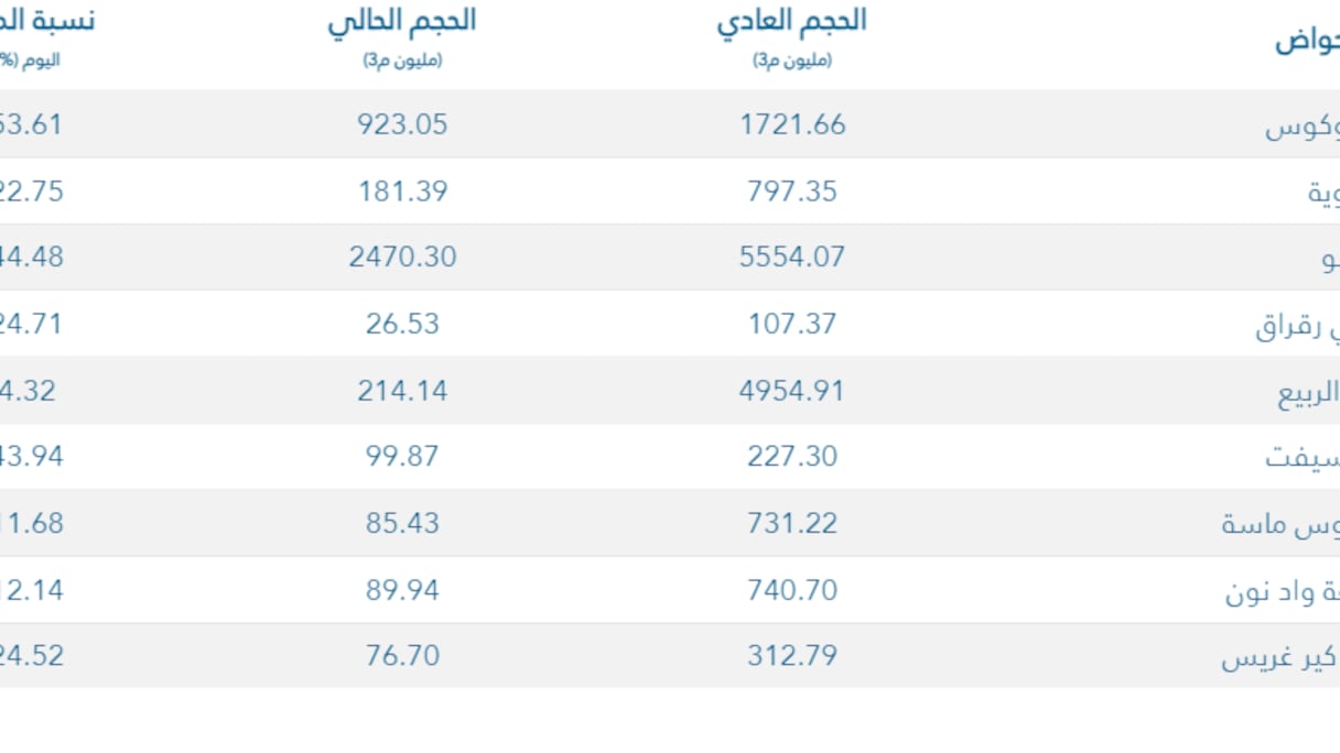 أما حوض زيز كير غريس فتبلغ نسبة الملء به 24 بالمائة، في حين وصلت نسبة ملء حوض درعة واد نون إلى 12.14 في المائة، ثم نسبة 11 في المائة بحوض سوس ماسة، في حين تم تسجيل أقل نسبة في حوض أم الربيع بـ 4.32 في المائة.