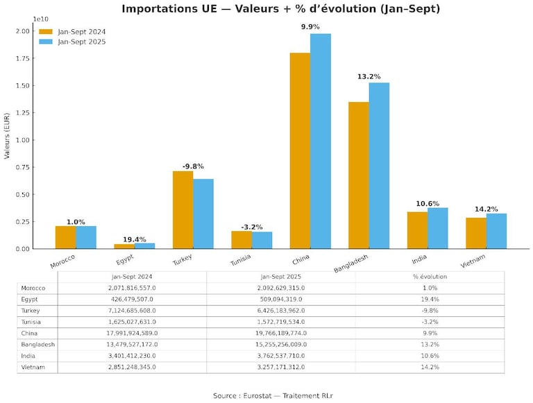 بعد ارتفاعٍ بنسبة 12.3% في الواردات الأوروبية من النسيج والملابس بنهاية النصف الأول من عام 2025، استمر هذا الاتجاه بنهاية شتنبر 2025، مع نمو بنيوي مدفوعٍ بالهجوم الآسيوي. تكشف أحدث معطيات أوروستات لنهاية شتنبر 2025، الصادرة عن الجمعية المغربية لصناعات النسيج والملابس، عن زيادات مستدامة للموردين الرئيسيين: بنغلاديش (زائد 13.2% إلى 15.25 مليار أورو)، والصين (زائد 9.9% إلى 19.76 مليار أورو)، وفيتنام (زائد 14.2% إلى 3.25 مليار أورو).