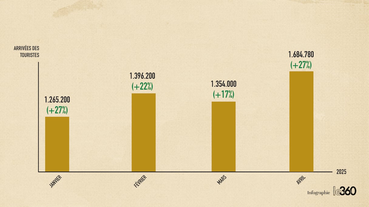 مع نهاية الأشهر الأربعة الأولى من العام، بلغ عدد السياح الوافدين 5.7 مليون زائر، بزيادة قدرها 23% مقارنة بالفترة نفسها من العام الماضي، وفقا لبيانات وزارة السياحة والصناعة التقليدية والاقتصاد الاجتماعي والتضامني. وخلال موسم الصيف، استقطب المغرب مليون زائر إضافي مقارنةً بالفترة نفسها من العام الماضي. هذا الأداء يضع المملكة بين أكثر الوجهات السياحية حيويةً في العالم.