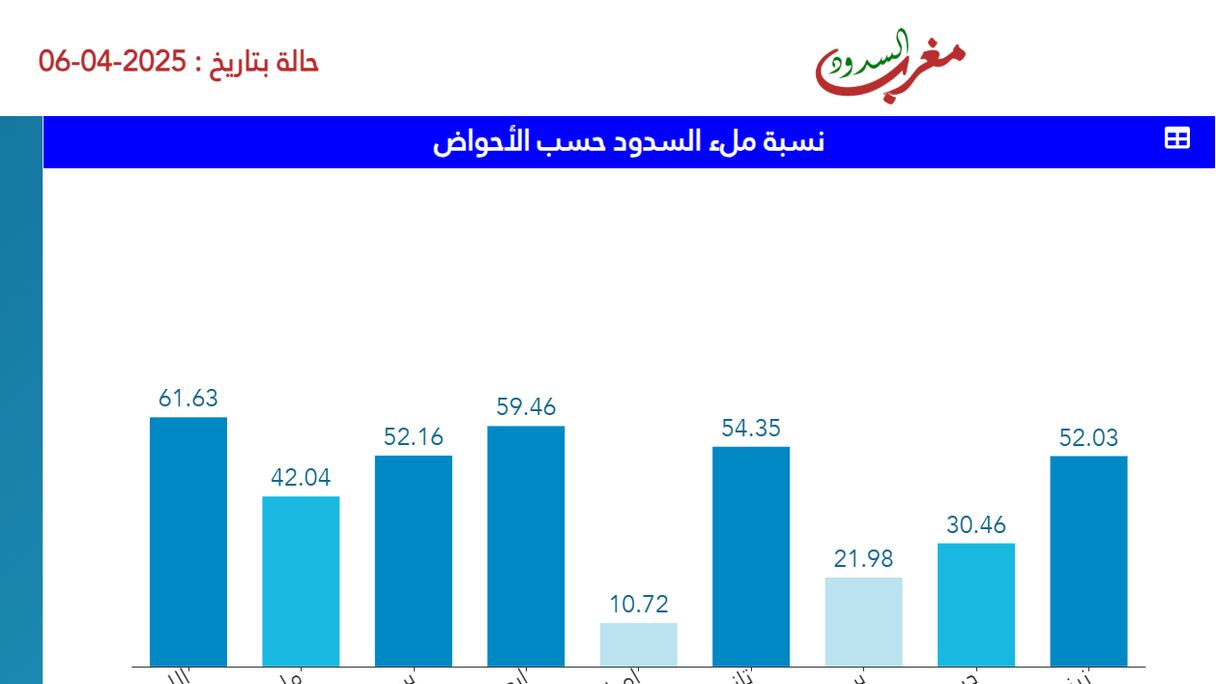 وسجلت أحواض المملكة ارتفاعا ملحوظا في حجم الواردات المائية، مسجلة نسب ملء متفاوتة، إذ سجل حوض اللوكوس أعلى نسبة ملء بـ61.63 في المائة، يليه حوض أبي رقراق بـ59.46 في المائة، ثم حوض تانسيفت بـ54.35، فحوض سبو بـ51.16 في المائة، متبوعا بحوض زيز كير غريس 52.03 في المائة، وحوض ملوية 43.04 في المائة، ثم حوض درعة واد نون % 30.46، وسوس ماسة نسبة 21.98، وحوض أم الربيع 10.72%.