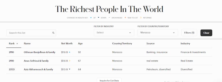 واحتل رجل الأعمال عثمان بنجلون وعائلته المرتبة الأولى على الصعيد الوطني، بثروة تقدر بـ1.6 مليار دولار، متقدما على كل من أنس الصفريوي وعزيز أخنوش، اللذين بلغا القيمة الصافية نفسها للثروة (1.6 و1.5 مليار دولار على التوالي)، حسب تقييم المجلة الذي اعتمد على أسعار الأسهم وسعر صرف العملات إلى غاية 7 مارس 2025.