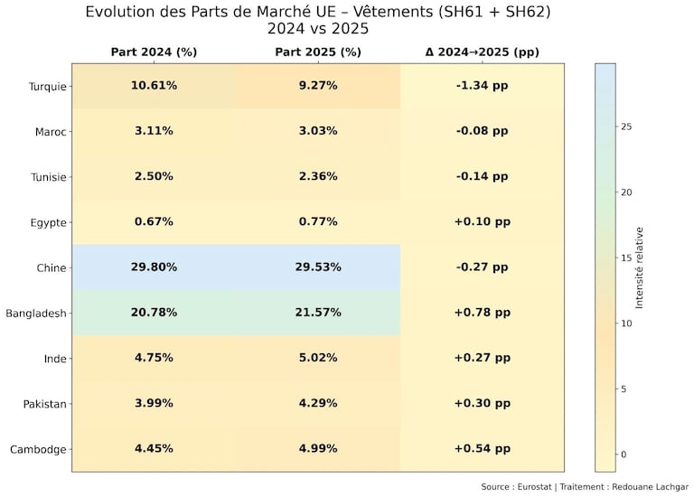 وأمام هذا الاكتساح الآسيوي الذي عززته الاتفاقيات، يبدو أن الموردين التقليديين القريبين من الاتحاد الأوروبي، مثل تركيا (ناقص 10.8%، ناقص 1.34 نقطة مئوية) وتونس على وجه الخصوص، هم أول من يتضرر بشكل مباشر. ويظهر المغرب أداء أفضل من تونس من حيث القيمة المطلقة، ولكن حصته السوقية تتقلص.