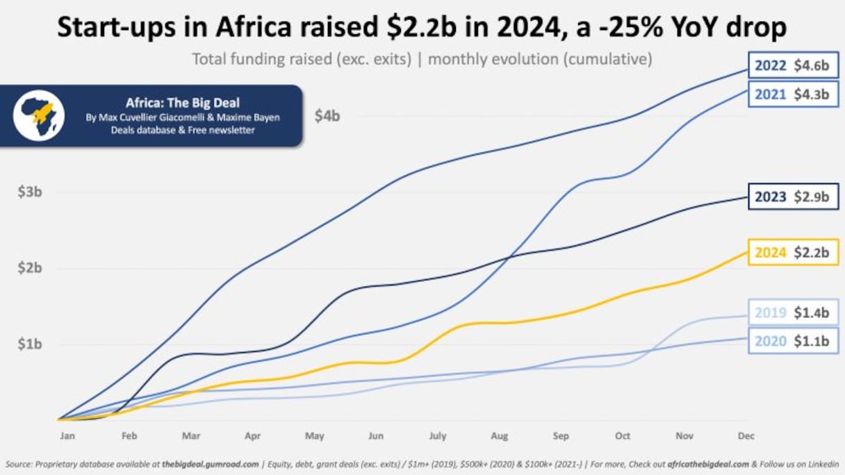 وكما يوضح ماكس كوفيليي جياكوميلي، أحد مؤسسي «أفريكا: ذا بيغ ديل»، فإن «سنة 2024، التي عرفت في البداية بطءً مع جمع 800 مليون دولار فقط في النصف الأول، شهدت انتعاشا كبيرا في النصف الثاني حيث تم جمع 1.4 مليار دولار، أي أزيد من 25% على أساس سنوي وبزيادة 80% مقارنة بالنصف الأول، مما يجعل النصف الثاني من عام 2024 ثاني أفضل نصف منذ بداية التباطؤ».