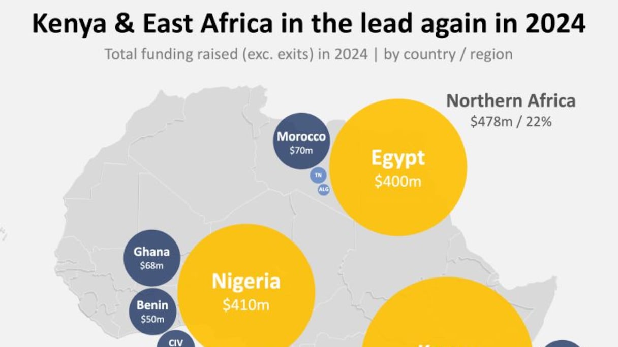 وعلى المستوى الإقليمي، اجتذبت شرق إفريقيا، بقيادة كينيا، 725 مليون (33%)، متقدمة على غرب أفريقيا بـ587 مليون (27%)، وشمال أفريقيا بـ478 مليون (22%)، والجنوب الأفريقي بـ397 مليون (18%). وتمكنت 188 شركة ناشئة أفريقية فقط من جمع مليون دولار أو أكثر في عام 2024، وهو رقم انخفض بنسبة 10% على أساس سنوي.