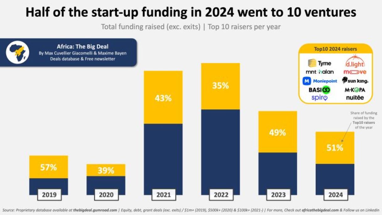 وتركز التمويل أيضا على عدد قليل من الفاعلين: أكبر 10 شركات جمعت أموالا هي: «Tyme» و«MNT-Halan» و«Moniepoint» و«BasiGo» و«Spiro» و«D.Light» و«Moove» و«Sun King» و«M-Kopa» و«Nuitée». واستحوذت لوحدها على 51% من الأموال المجمعة في القارة. تركيز عرف ارتفاعا طفيفا بعدما بلغ ثقل هذه الشركات العشر 49% فقط في عام 2023، و35% في عام 2022، و43% في عام 2021.