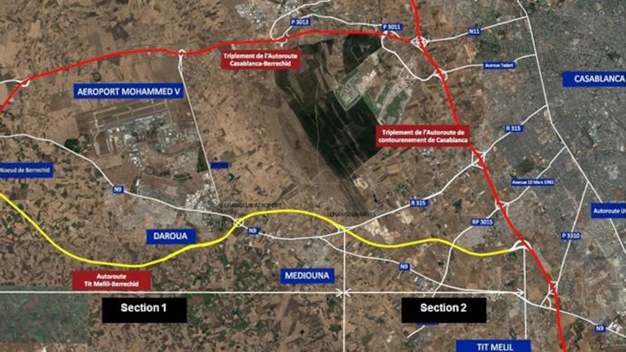 وتم تقسيم برمجة الأشغال على أربع مقاطع؛ المقطع1 : بين مفترق الطريق السيار لبرشيد والدروة (11 كلم)، المقطع2 : بين الدروة ومديونة (10 كلم)، المقطع3 : بين مديونة ومفرق الطريق السيار تيط مليل (10 كلم)، المقطع4 : هذا المقطع يهم إنجاز 4 قناطر بين مفترق الطريق السيار لبرشيد وبدال مطار محمد الخامس على الطريق الوطنية رقم 9.