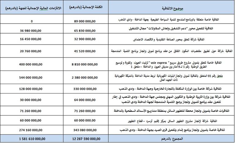 وهكذا، فقد أبرم المجلس الجهوي، في إطار تفعيل النموذج التنموي الجديد للأقاليم الجنوبية الذي أعطى انطلاقته الملك محمد السادس، عقد برنامج التنمية المندمجة الخاص بجهة الداخلة – وادي الذهب، والاتفاقيات الـ11 المنبثقة عنه، بغلاف مالي إجمالي يصل لـ12.287.590.000,00 درهم، يساهم المجلس الجهوي في تمويله بـ1.581.610.000,00 درهم، وذلك تفعيلا لآلية التعاقد بين الجهة والدولة، واعتمادا على مبادئ الحكامة المسؤولة، بالإضافة إلى البرامج الأخرى التي تعنى بالصحة والتعليم والسكن والتشغيل.