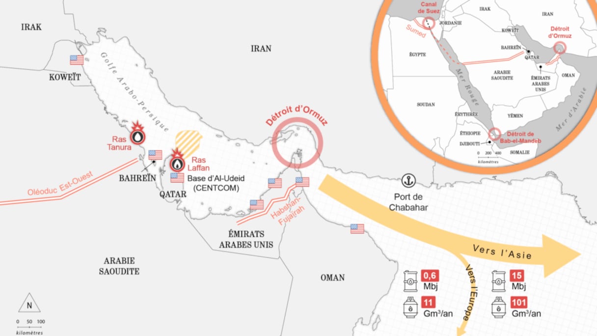 Une carte du détroit d'Ormuz donnant une idée sur les quantité de pétrole et de gaz transitant par ce canal perturbé par la guerre du Moyen-Orient.