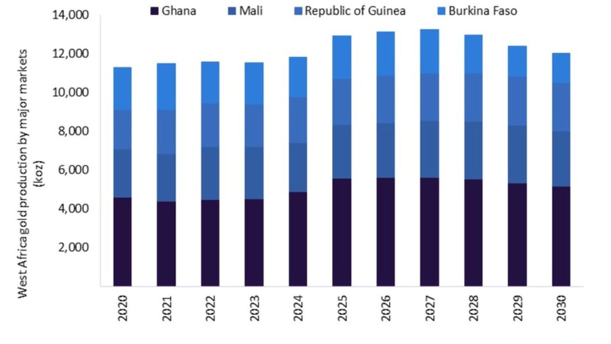 Production d'or en Afrique de l'Ouest provenant des principaux marchés (milliers d'onces), 2020-2030.