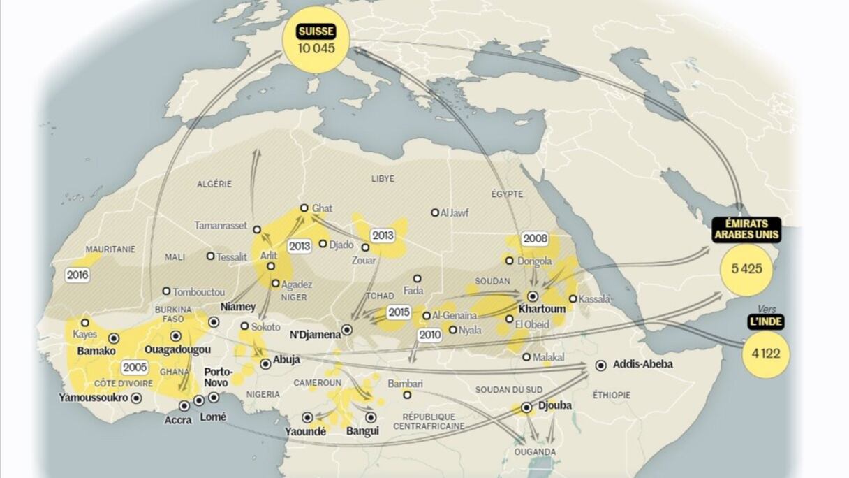 وأصبحت طرق التهريب معروفة جيدا الآن. ويمر جزء كبير من الذهب غير المصرح به عبر شبكات غير رسمية في منطقة الساحل وجمهورية الكونغو الديمقراطية وساحل العاج.