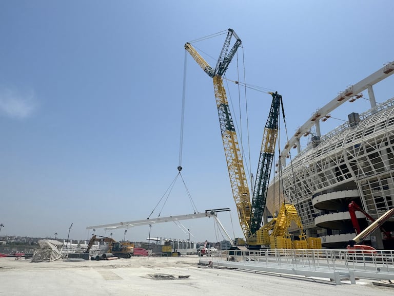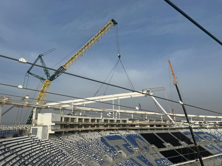 (Said Kadry/le360)(Said Kadry/le360)(Said Kadry/le360)عملية رفع وتركيب العوارض الفولاذية بسقف ملعب طنجة الكبير (Said Kadry/le360)في 16/06/2025 على الساعة 12:05