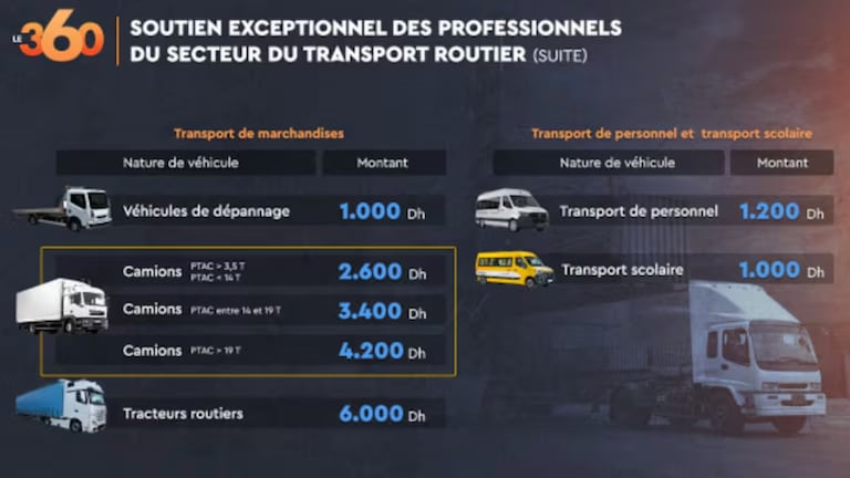 ويوضح مهني قائلا: «شاحنة مقطورة تقطع 10.000 كلم شهريا تستهلك في المتوسط 35 لترا لكل 100 كلم، أي حوالي 3.5 طن من الغازوال شهريا ، ستحصل على دعم يقارب 10.000 درهم، مقابل 6.000 درهم حاليًا وفق نظام الحمولة.