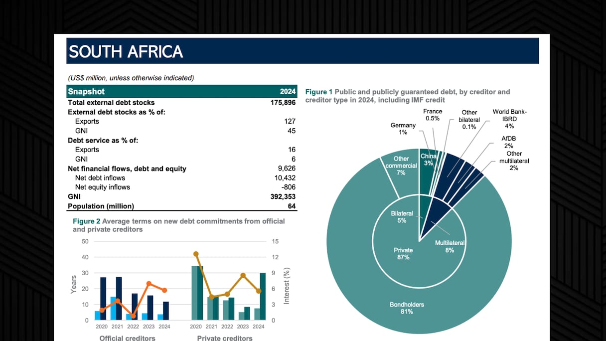 وتعد جنوب إفريقيا الدولة الأكثر مديونيةً خارجيا، إذ يبلغ مجموع ديونها 175.90 مليار دولار، منها 153 مليار دولار مستحقة للقطاع الخاص. ويمثل هذا المبلغ 127% من صادراتها و45% من ناتجها الداخلي الخام. ونظرا لحجم الدين وهيمنة الدائنين من القطاع الخاص، بلغت خدمة الدين في البلاد 19 مليار دولار في عام 2024.