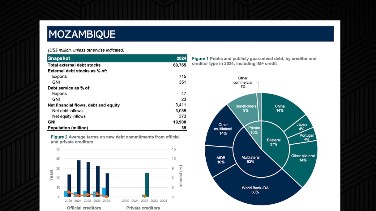 وبلغ مجموع الدين الخارجي لموزمبيق 69.76 مليار دولار، مع خدمة دين قدرها 4.47 مليار دولار في عام 2024.