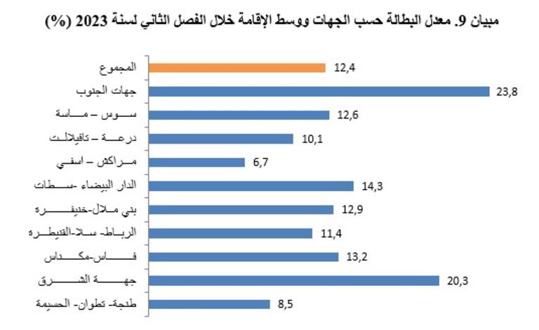 وكشف تقرير للمندوبية السامية للتخطيط، الخميس 3 غشت 2023، أن معدل البطالة انتقل من %11،2 إلى %12،4على المستوى الوطني؛ بحيث قفز من %15،5 إلى %16،3 بالوسط الحضري ومن %4،2 إلى %5،7 بالوسط القروي. إذ يبقى معدل البطالة مرتفعا بين الشباب البالغين مابين 15 و24 سنة (33،6%)، وحاملي الشهادات (19،2%) والنساء (17%).
