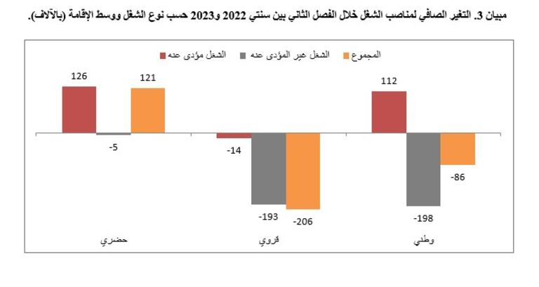 ويعزى هذا التراجع إلى فقدان 206.000 منصب شغل بالوسط القروي وإحداث 121.000 منصب شغل بالوسط الحضري، مقابل إحداث 133.000 منصب خلال الفصل الثاني من 2022.