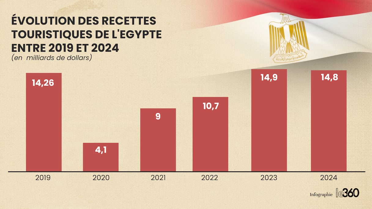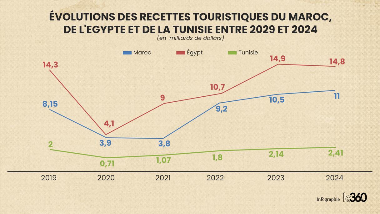 Évolution des recettes touristiques du Maroc, et l'Egypte et de la Tunisie entre 2019 et 2024.. le360 Afrique/Youssef