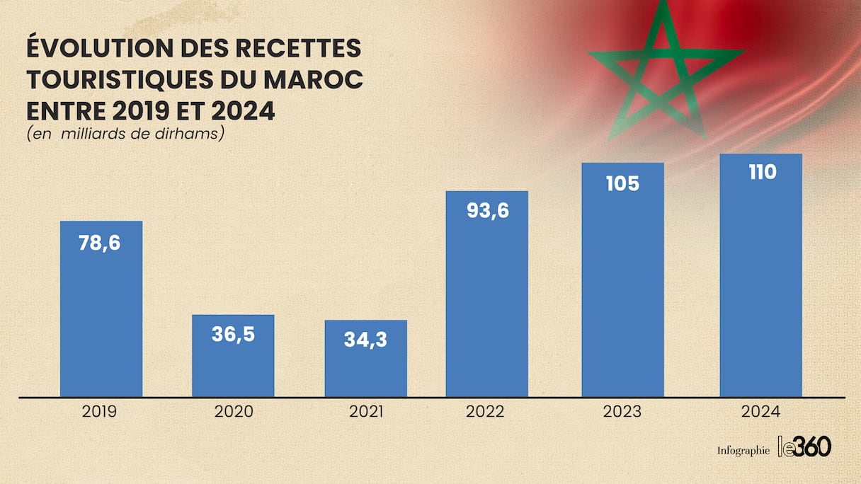 بعد استقبال عدد قياسي من السياح (17.4 مليون سائح)، حقق المغرب أيضًا عائدات سياحية قياسية بلغت 110 مليارات درهم، وفقًا لوزيرة السياحة، الصناعة التقليدية، والاقتصاد الاجتماعي والتضامني، فاطمة الزهراء عمور. وهذا المستوى الاستثنائي يجعل عائدات السفر واحدة من أهم مصادر العملة الصعبة للمملكة بعد الصادرات وتحويلات المغاربة المقيمين في الخارج.