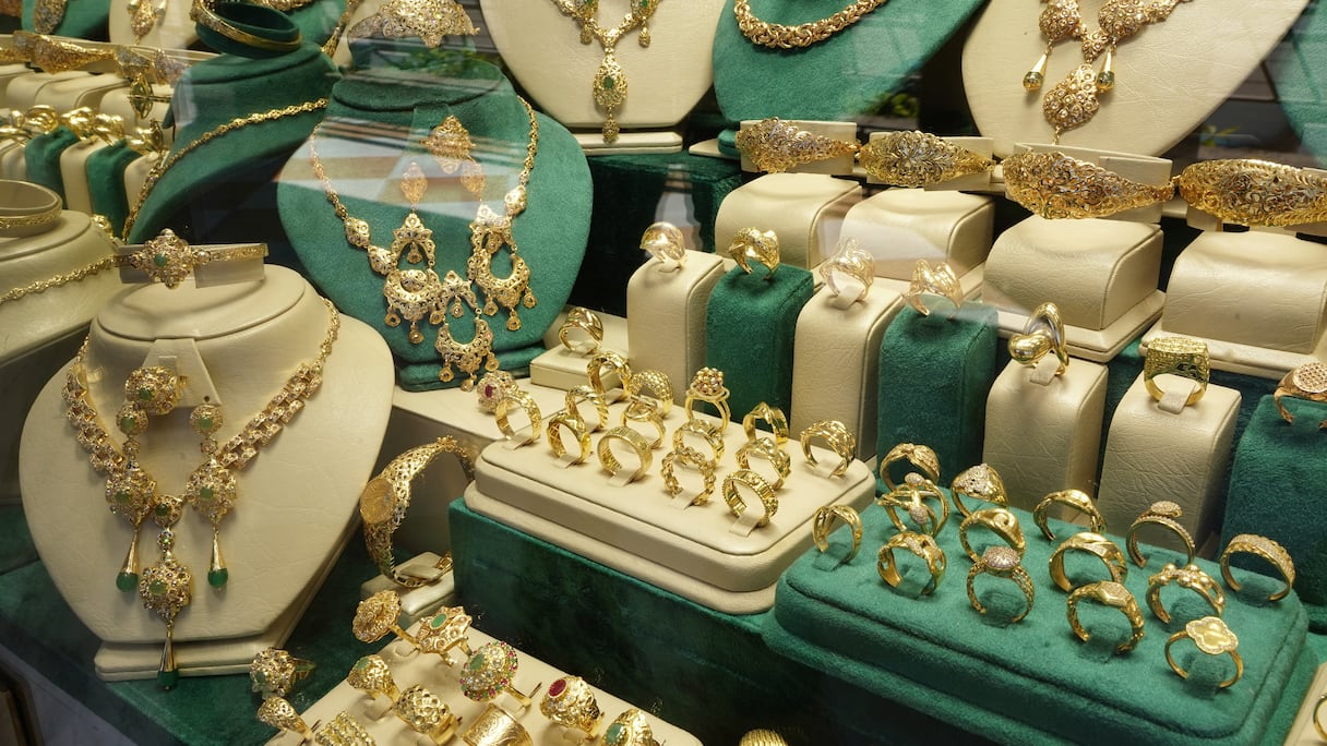 Vitrine d'une bijouterie à Rabat exposant des parures en or et des modèles traditionnels travaillés. (K.Essalak/Le360)