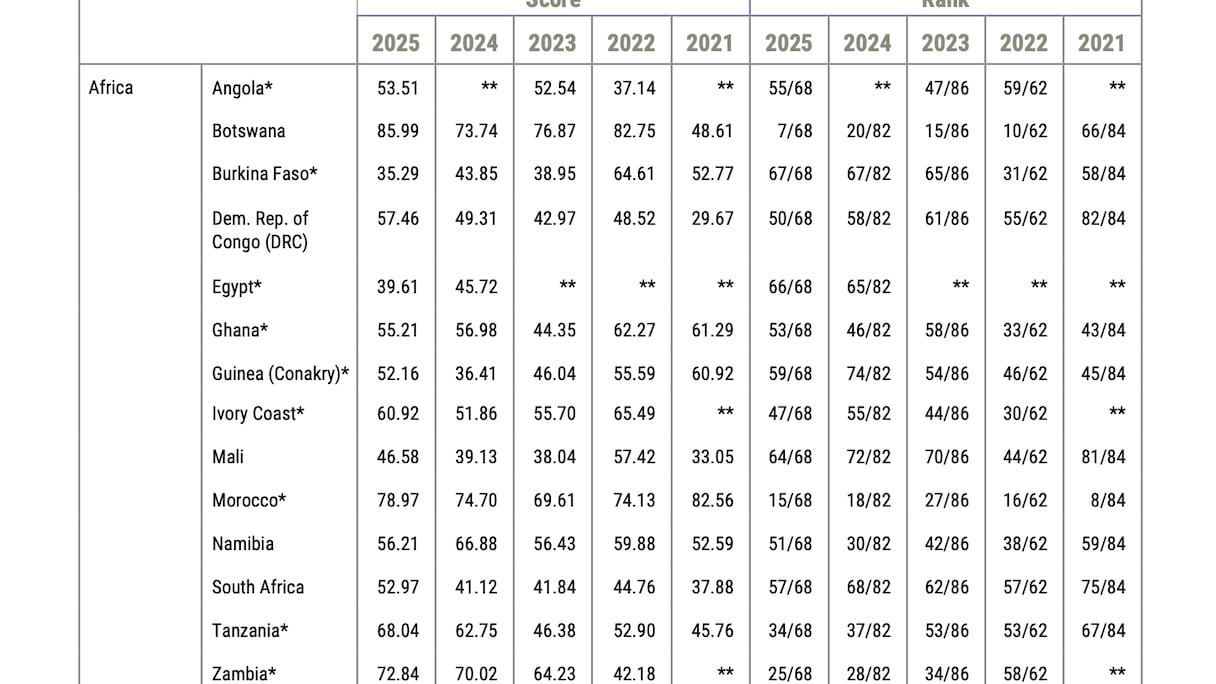 وتلي هاتين الدولتين زامبيا (بمجموع 72.84 نقطة، في المرتبة 25 عالميا)، وتنزانيا (68.04 نقطة، في المرتبة 34)، وساحل العاج (60.92 نقطة، في المرتبة 47)، وجمهورية الكونغو الديمقراطية (57.46 نقطة، في المرتبة 50)، وناميبيا (56.21 نقطة، في المرتبة 51)، وغانا (55.21 نقطة، في المرتبة 53)، وأنغولا (53.51 نقطة، في المرتبة 55)، وجنوب أفريقيا (52.97 نقطة، في المرتبة 57).