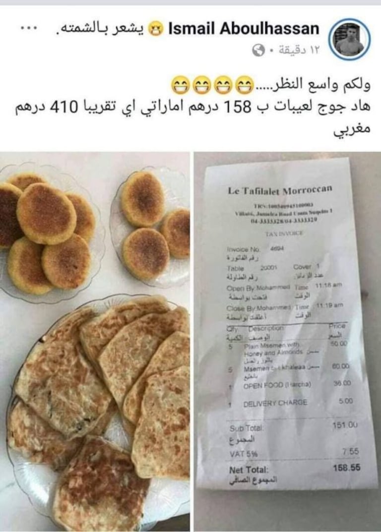 إذ بلغت قيمة ثلاث أطباق من المسمن بالخليع، المسمن باللوز والحرشة 158 درهم إماراتي، أي ما يعادل 410 درهم مغربي.
