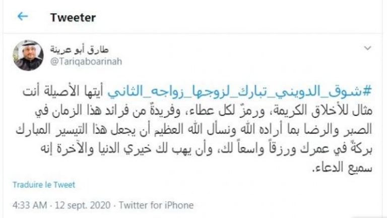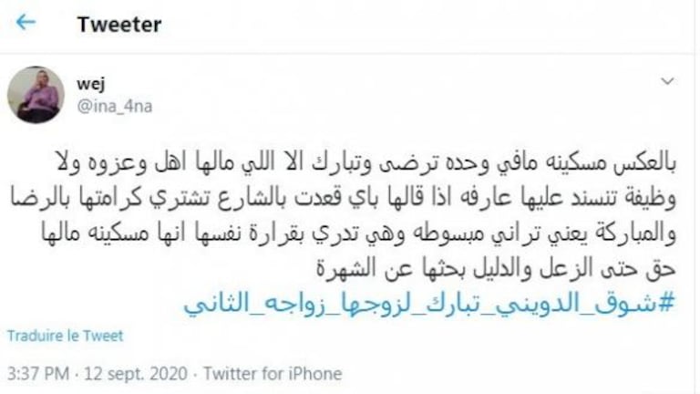 ونشرت الناشطة السعودية مقطع فيديو يوثق احتفالها بزواج والد أطفالها بسيدة ثانية، عبر حسابها على "تويتر"، علقت عليه بالقول: "هديتي المتواضعة لزوجي بمناسبة زواجه الثاني وحبيت أشاركها معكم لنشر السلام والالفة بين الأُسر السعودية".