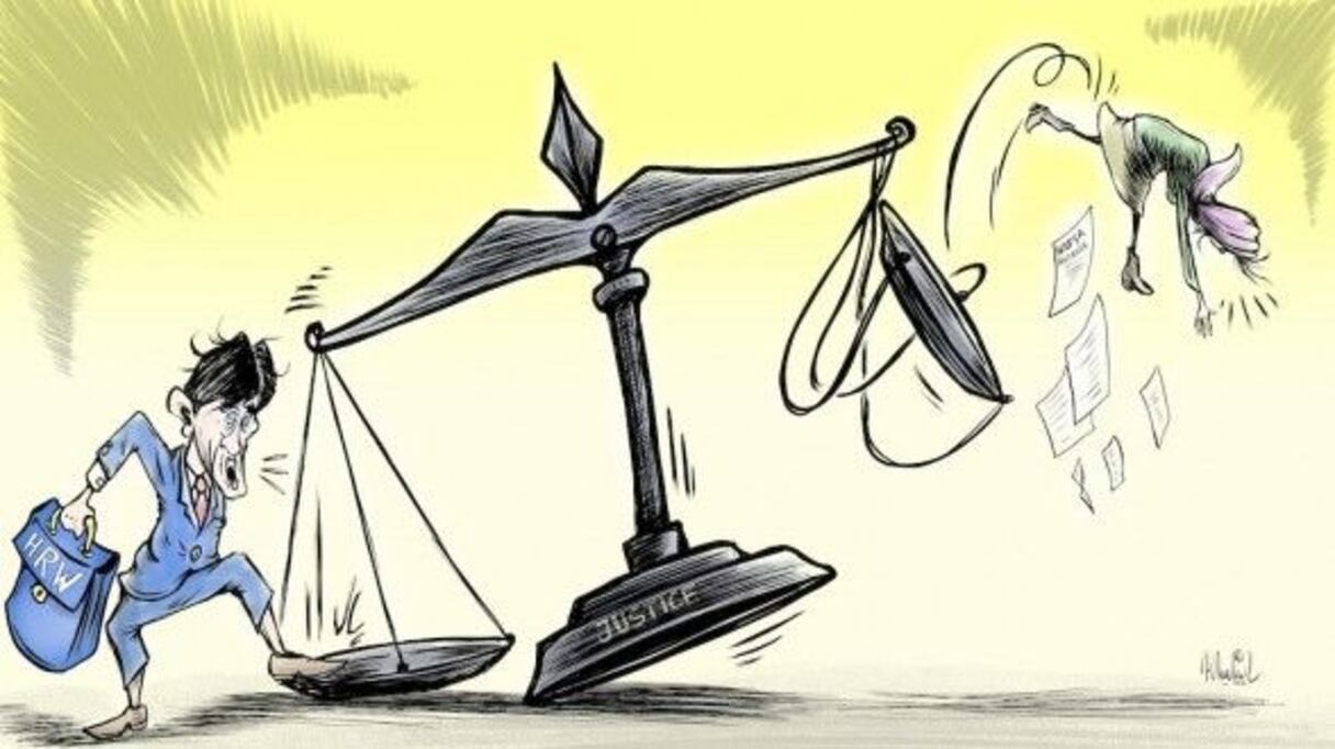 المنظمات الحقوقية الدولية لا تتوقف عن إدهاشنا بتصرفاتها. فقد قامت هيومن رايتس ووتش بالتلاعب بأقوال صاحبة شكوى من أجل تقويض اتهامها بالاغتصاب ومحاولة إثبات فرضية وجود مؤامرة سياسية. (كاريكاتير).