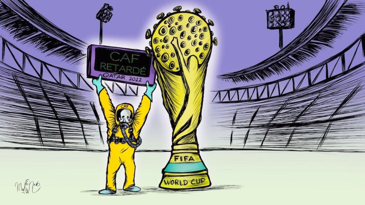 يبدو أن منتخبات القارة الإفريقية ستكون آخر الملتحقين بنهائيات كأس العالم القادمة، المقرر إقامتها عام 2022 بدولة قطر، وذلك عقب تأجيل التصفيات الخاصة بالقارة السمراء إلى نهاية العام الجاري. (كاريكاتير).