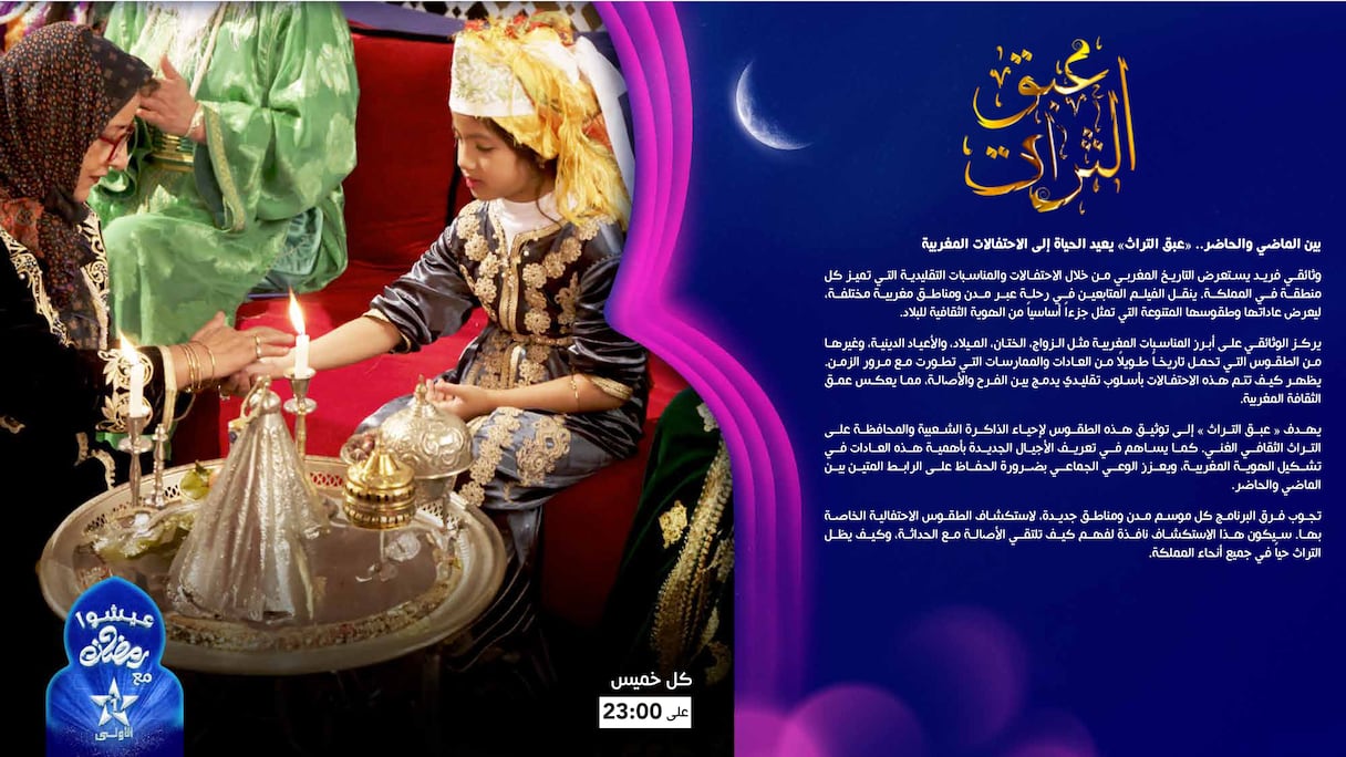 وفي إطار رسالتها الإعلامية الهادفة إلى تعزيز الثقافة الوطنية، تقدم القناة الأولى برامج وثائقية تسلط الضوء على التراث المغربي، من بينها « من سوق لسوق »، الذي يأخذ المشاهدين في رحلة لاستكشاف تاريخ وعادات الأسواق التقليدية المغربية، بالإضافة إلى مواسم جديدة من برامج مثل « أمالاي »، و »أرض البركة »، و »عبق التراث »، و »عيوط ومكاحل » و »أهل المغرب »، والتي تعكس أصالة الثقافة المغربية.