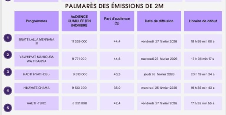 أما المرتبة الثالثة على القناة الثانية، فكانت من نصيب المسلسل التركي «هاديك حياتي»، الذي حقق 9.5 مليون مشاهد، متقدما على المسلسل المغربي «حكايات شامة».