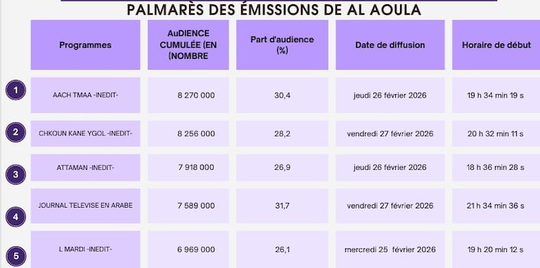 وبالنسبة للقناة الأولى، ارتقى مسلسل «أش تما» إلى صدارة الترتيب 8.2 مليون مشاهد وحصة 30.4%، بعدما كان يحتل المرتبة الثالثة سابقا. ويعرض العمل يوميا في الساعة السابعة والنصف مساء، وهو من إخراج أيوب لهنود وبطولة السعدية لاديب ومريم الزعيمي.