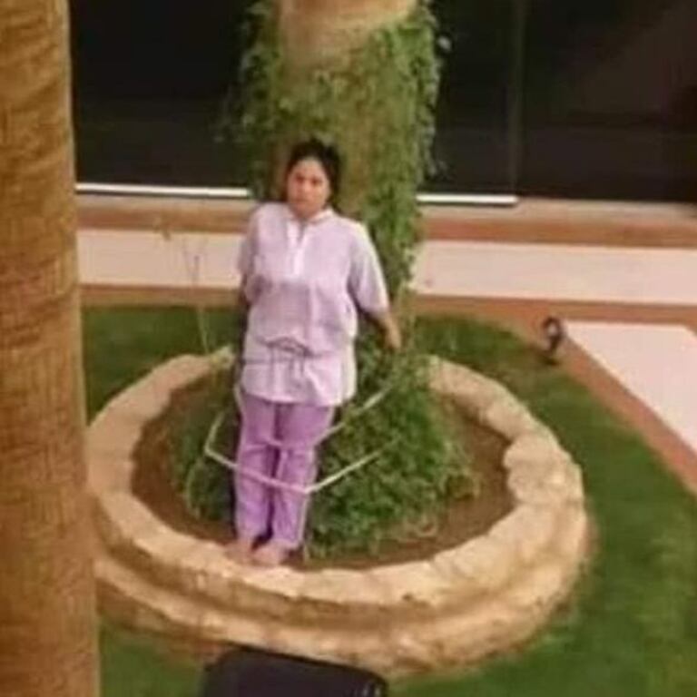 وتُظهر الصور كوستا وهي مقيدة من يدها وقدمها في حديقة المنزل الذي تعمل به لساعات طويلة، وسط الشمس الحارقة لعقابها على ما فعلته.