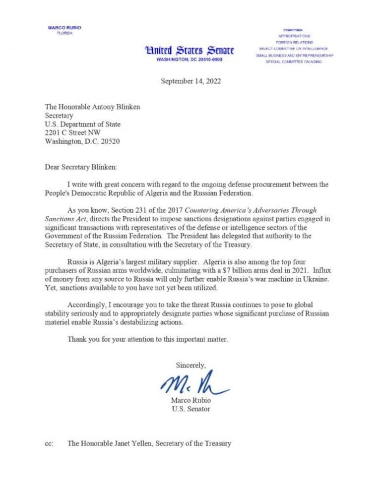 وأكد السيناتور عن ولاية فلوريدا في رسالة وجهها إلى وزير الخارجية الامريكي أنتوني بلينكين، على ضرورة معاقبة الدول التي تقتني الأسلحة الروسية وتساعد على زعزعة الاستقرار، مشيرا إلى أن الجزائر من بين أربعة مشترين كبار للأسلحة الروسية، حيث بلغت مشتريات الجزائر للأسلحة الروسية 7 مليارات دولار سنة 2021.