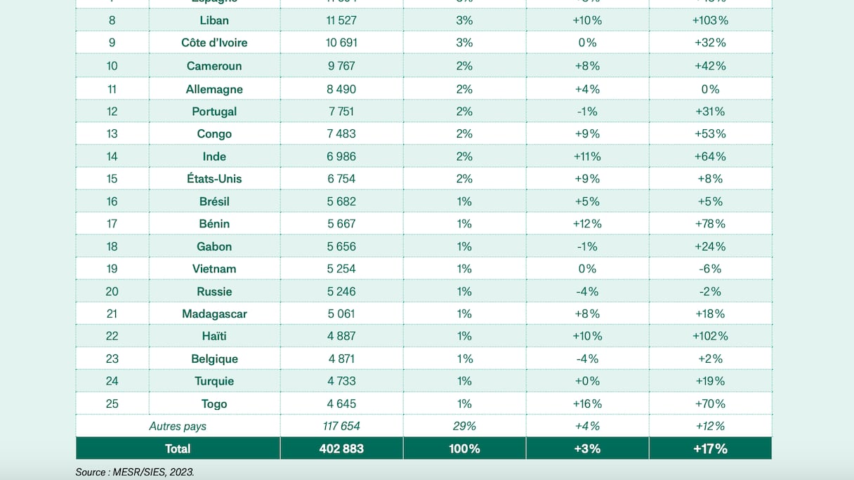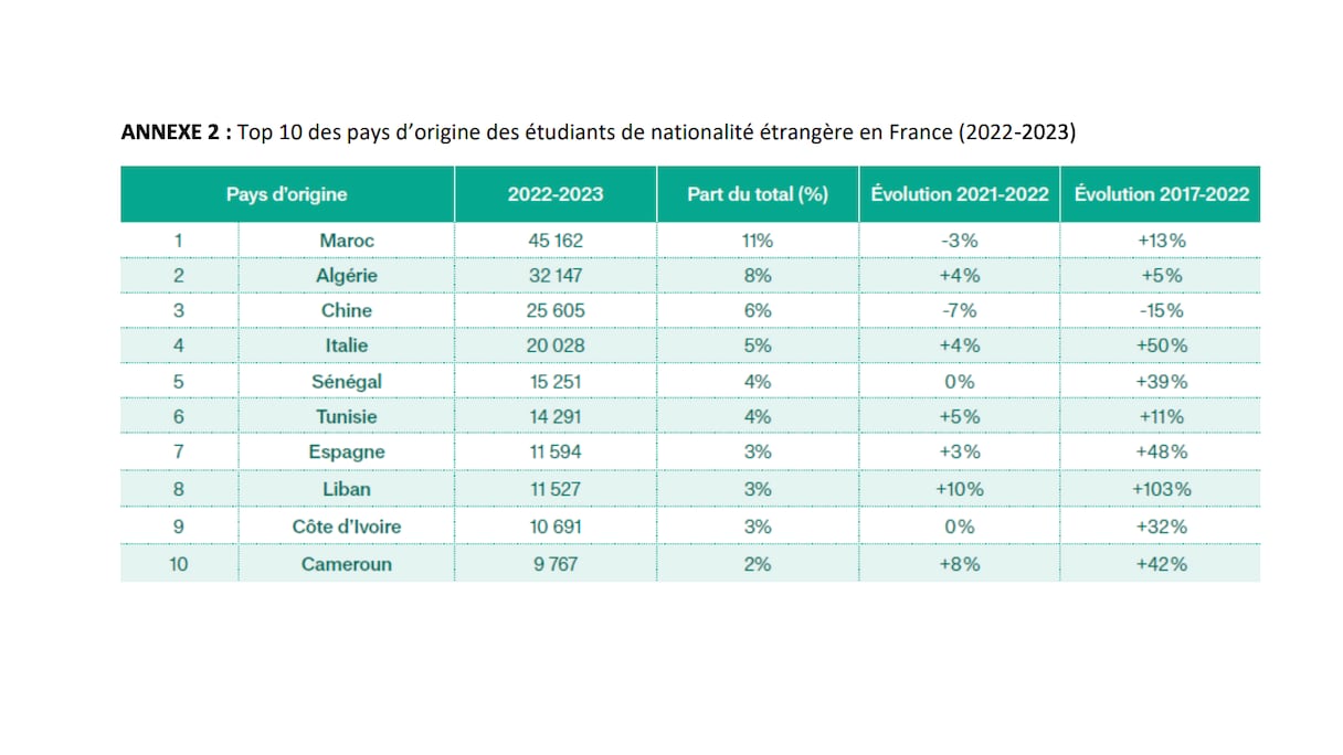 والدليل على الحضور القوي للطلاب الأفارقة في الجامعات الفرنسية، أن هناك 11 دولة إفريقية ضمن أفضل 25 دولة تضم أكبر عدد من الطلاب في فرنسا، وفق تقرير كامبيس فرانس « Campus France ». بل إن ست دول منها توجد في المراكز العشرة الأولى. المركزان الأولان في العالم تحتكرهما دولتان أفريقيتان: المغرب والجزائر.