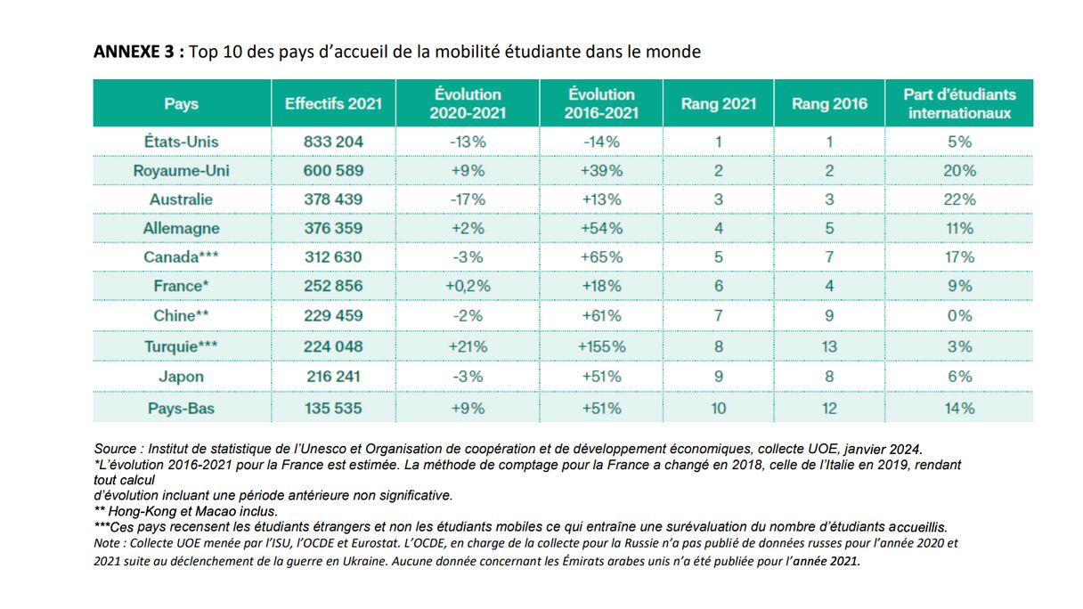 تظل فرنسا إحدى الوجهات الأساسية للطلاب الأفارقة الذين يرغبون في متابعة دراستهم العليا في الخارج. بل إن البلاد تجاوزت عتبة 400 ألف طالب أجنبي مسجلين في جامعاتها ومدارسها الكبرى لأول مرة في 2022-2023. ومن المتوقع أن يرتفع هذا العدد في السنوات القادمة مع العلم أن فرنسا تستهدف الوصول إلى 500 ألف طالب أجنبي في عام 2027. وهذا السقف سيتم تحقيقه بلا شك، على اعتبار أن متوسط النمو السنوي في عدد الطلاب الأجانب الذين تم استقبالهم في فرنسا بلغ 8% خلال السنوات 15 الماضية. وهكذا، تحتل فرنسا المرتبة السادسة في العالم من حيث استقبال الطلاب الأجانب، بعد الولايات المتحدة والمملكة المتحدة وأستراليا وألمانيا وكندا.