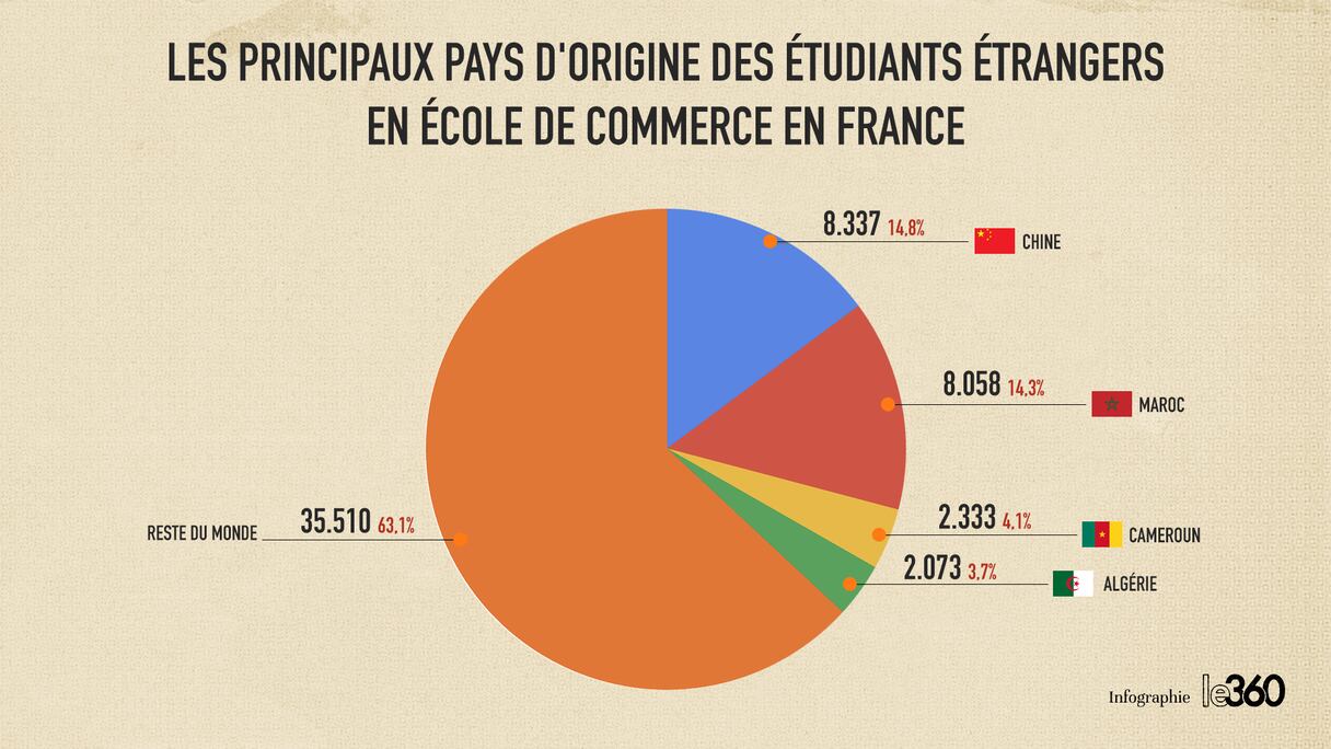 وينطبق الشيء نفسه على مدارس التجارة الفرنسية، وهي أيضا من بين المدارس الأكثر شهرة في العالم، بعد المعاهد الأنجلوسكسونية. وفي هذا الصدد، إذا كانت الصين هي الأكثر تمثيلا على مستوى هذه المؤسسات بـ8.337 طالبا، فإنها تليها مباشرة المغرب بـ8.058 طالبا، لتحتل بفارق كبير المرتبة الأولى على مستوى القارة الإفريقية، بحصة تبلغ 14% من مجموع الطلاب الأجانب المسجلين في هذه المدارس.
